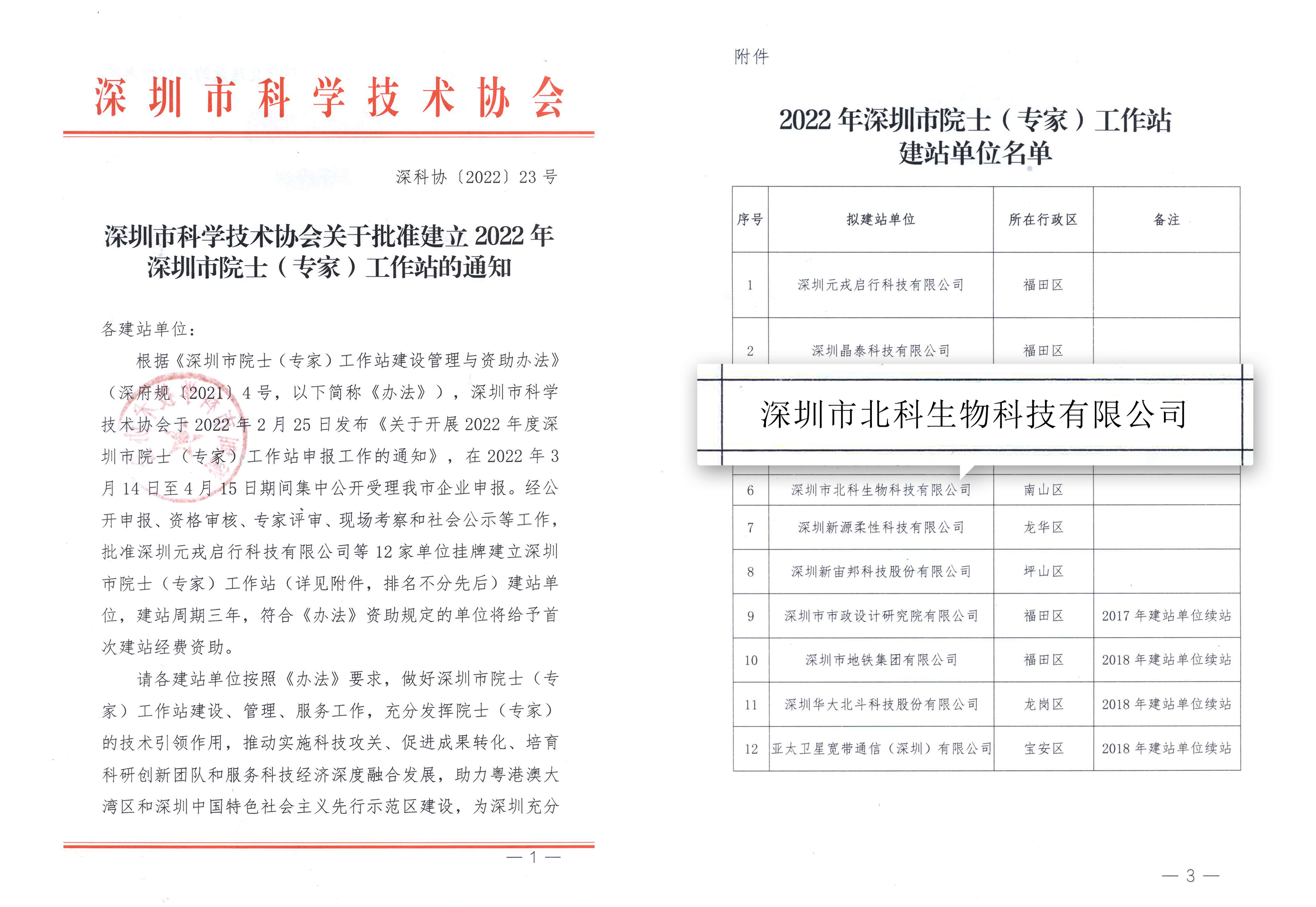 2022年6月27日,深圳市科學技術(shù)協(xié)會發(fā)布通知,按照《深圳市院士(專家)工作站建設(shè)管理與資助辦法》(深府規(guī)〔2021〕4號)有關(guān)要求,經(jīng)過公開申報、資格審核和專家評審、現(xiàn)場考察和社會公示等工作,同意深圳市北科生物科技有限公司建立深圳市院士(專家)工作站。