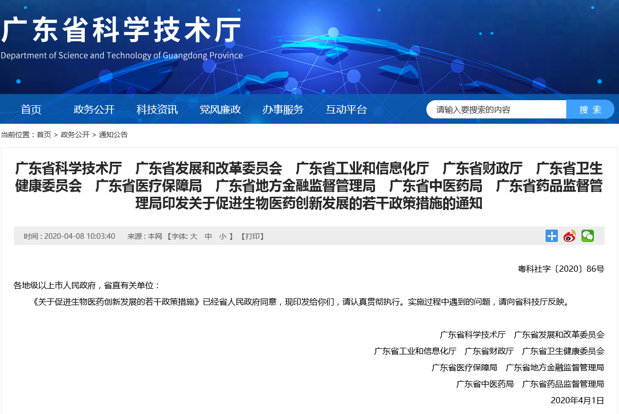 2020年4月8日,廣東省科學(xué)技術(shù)廳、廣東省發(fā)展和改革委員會(huì)、廣東省工業(yè)和信息化廳、廣東省財(cái)政廳、廣東省衛(wèi)生健康委員會(huì)、廣東省醫(yī)療保障局、廣東省地方金融監(jiān)督管理局、廣東省中醫(yī)藥局、廣東省藥品監(jiān)督管理局等九部門(mén)聯(lián)合印發(fā)《關(guān)于促進(jìn)生物醫(yī)藥創(chuàng)新發(fā)展的若干政策措施》(以下簡(jiǎn)稱《措施》),致力于提升生物醫(yī)藥原始創(chuàng)新能力和國(guó)際競(jìng)爭(zhēng)力,推動(dòng)生物醫(yī)藥科技和產(chǎn)業(yè)高質(zhì)量發(fā)展,提高生物安全治理能力。